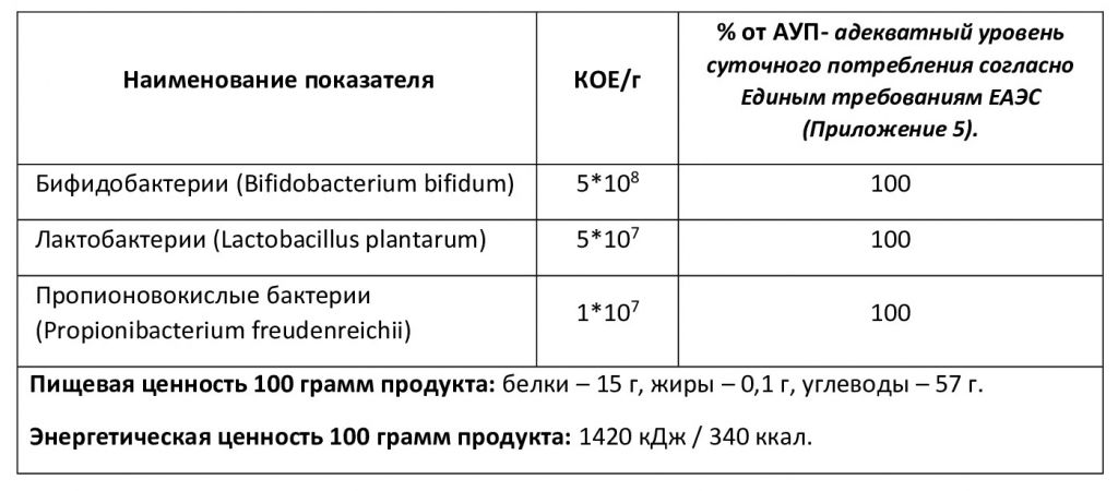 Консорциум микроорганизмов-пробиотиков представлен следующими видами бифидо, лакто, и пропионовокислых бактерий: Bifidobacterium bifidum, Lactobacillus plantarum, Propionibacterium freudenreichii.