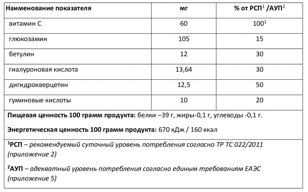 Состав: коллаген гидролизованный, мумиё алтайское, глюкозамина сульфат, витамин С (аскорбиновая кислота), натрия гиалуронат, дигидрокверцетин, березовый экстракт. Вспомогательные вещества: целлюлоза микрокристаллическая (носитель), капсула желатиновая (желатин, глицерин), антислеживатели: кальция стеарат, кремния диоксид.